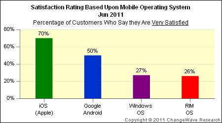 The brand satisfaction results for the iPhone were also excellent – a whopping 70 percent of respondents said they were satisfied with iOS, while only 50% reported those same feelings for Android, while only 27% were satisfied with Windows Mobile, and merely 26% with BlackBerry OS.