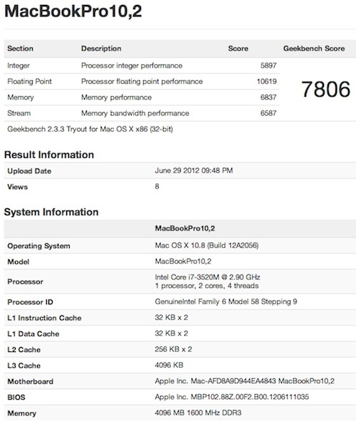 […]information included in the Geekbench result is consistent with what would be expected on the new machine. The machine is listed as running a 2.9 GHz Intel Core i7-3520M processor, which is offered in the high-end model of the non-Retina 13-inch MacBook Pro. The machine is also listed as running Build 12A2056 of OS X Mountain Lion, with the four-digit build number suffix frequently being used on Apple’s custom operating system builds.
