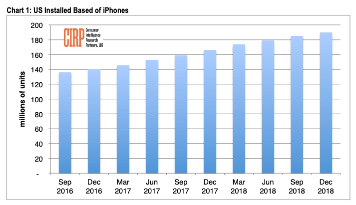 CIRP analysis indicates the iPhone US installed base reached 189 million units as of December 30, 2018, compared to 185 million units at the end of the September 2018 quarter and 166 million units at the end of the December 2017 quarter (Chart 1). CIRP bases this estimate on an estimated global sales of 62 million iPhones, which is in turn derived from an estimated Average Selling Price (ASP) of $839 and Apple, Inc. disclosed iPhone revenues.