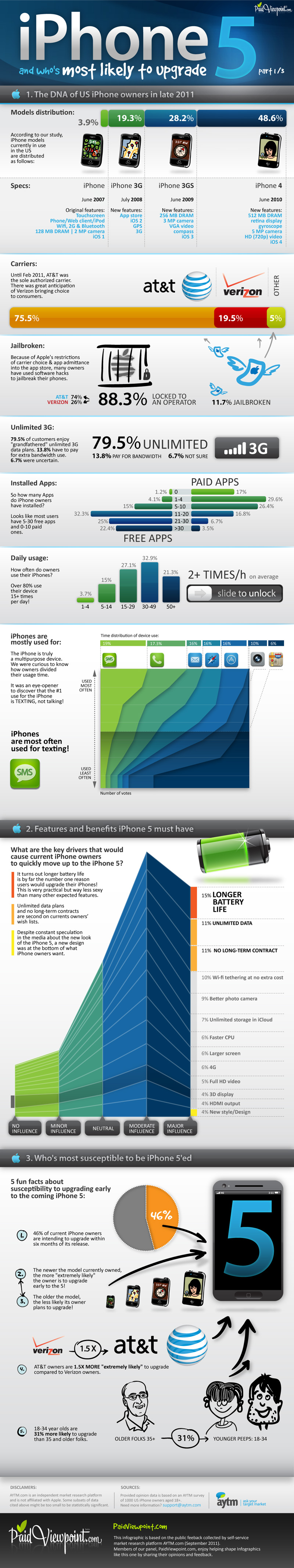 The infographic, shown below (click to expand), helps map out that “state of the upgrade” by looking at the number of installed apps, how often you use your iDevice, and what features they expect from the new device. The infographic is part one of a three-part series leading up to the launch of the iPhone 5, which is expected to be unveiled on October 4th.