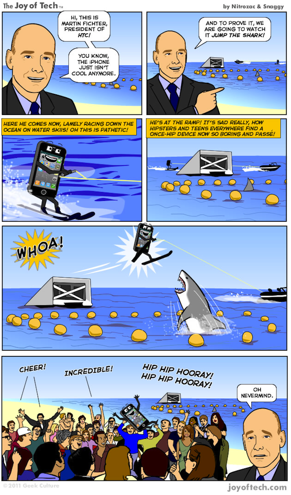 Considering HTC acting president Martin Fichter’s recent ridiculous comments claiming that the college students no longer consider the Phone to be “cool,” I was delighted to come across AllThingsD’s brilliant web comic summing up the event in hip shark-jumping fashion.