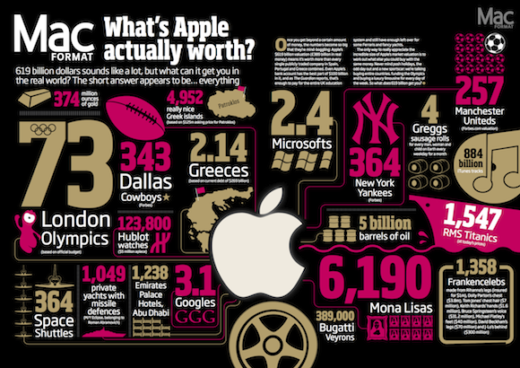 Apple’s worth a whole bunch of money – and while their market value has both risen and sunk significantly this year, there’s still a whole lot of wallop behind their financials. But just how big are they? The folks at MacFormat have put together an infographic to put things into perspective! You can click on the image to see a larger version.