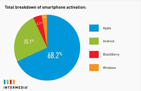 Intermedia manages more than 500,000 premium-hosted e-mail accounts with Microsoft Exchange. According to the company’s data collected from September through November, Apple’s iPhone represented 68.2 percent of smartphone activations by small and medium businesses.