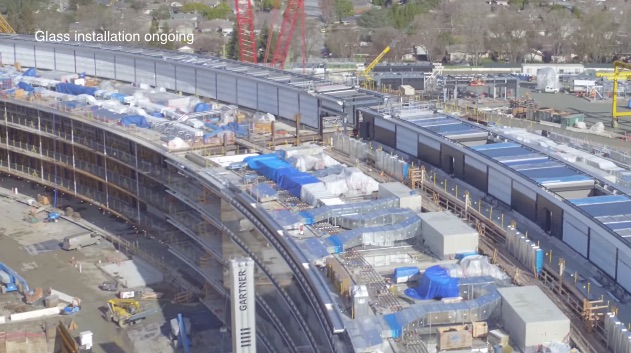 The video gives a great shot of the roof being lifted into place, along with an excellent look at the large, curved glass panels being installed on the 2.8 million square foot ring-shaped main building. A solar array has also been affixed to one of the parking structures that will house the vehicles of the approximately 13,000 workers who will fill the campus upon its completion.