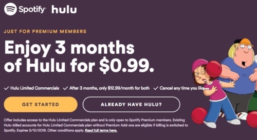 Spotify Premium subscribers will be able to upgrade their existing plan to the new combo pricing, and will get a three-month Hulu subscription for only $0.99. The $12.99 per month price of the bundle will kick in at the end of the three month period.