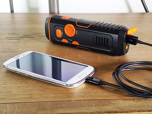 The 1TAC Safety Charge is equipped with a flashlight, emergency radio, siren, and a charger to keep your devices fully powered.