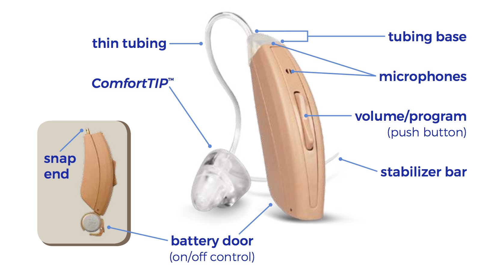 The main electronics of the hearing aid are contained in a small casing that fits behind your ear. A small, almost invisible tube goes to the earpiece, which fits into your outer ear canal.