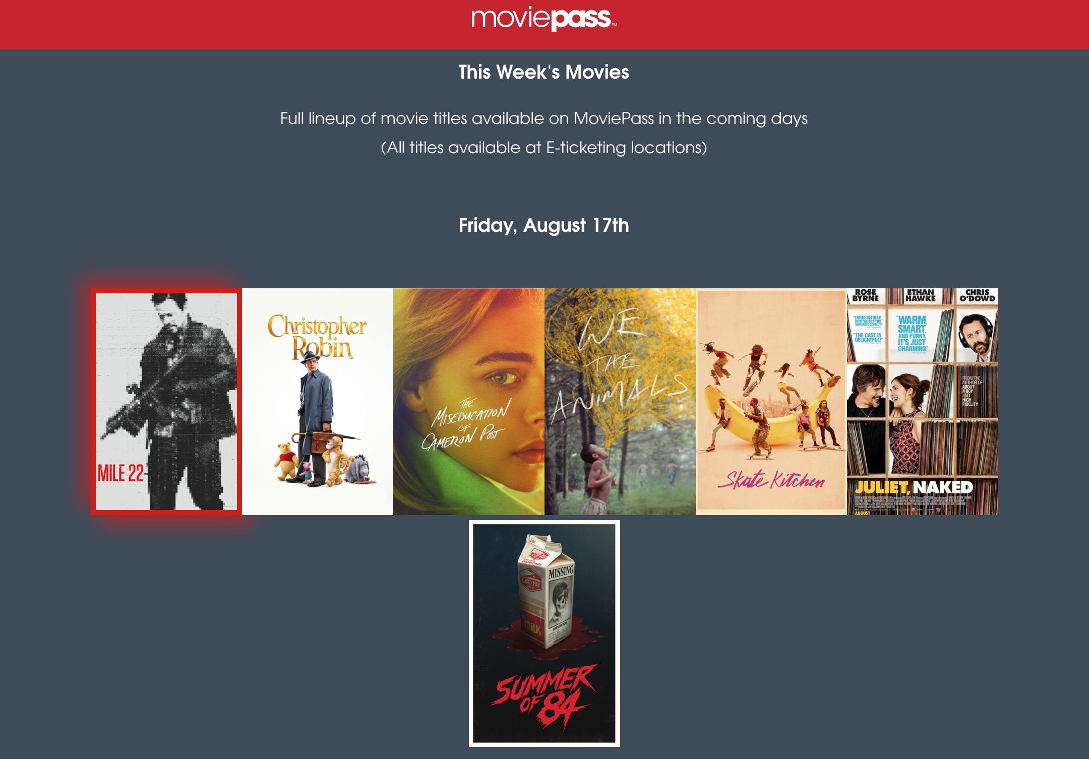 On the MoviePass site, MoviePass lists “This Week’s Movies,” a section described as a “full lineup of movie titles available on MoviePass in the coming days.”