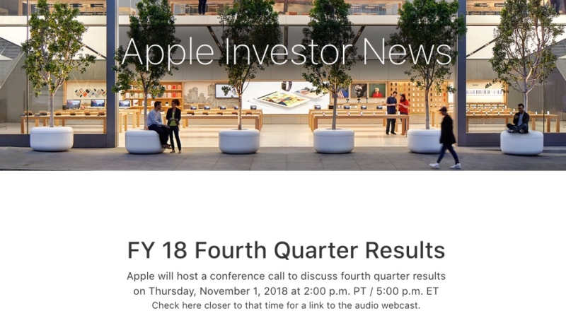 Apple says it will announce its earning results for the fiscal fourth quarter (third calendar quarter) of 2018 on Thursday, November 1, 2018.
