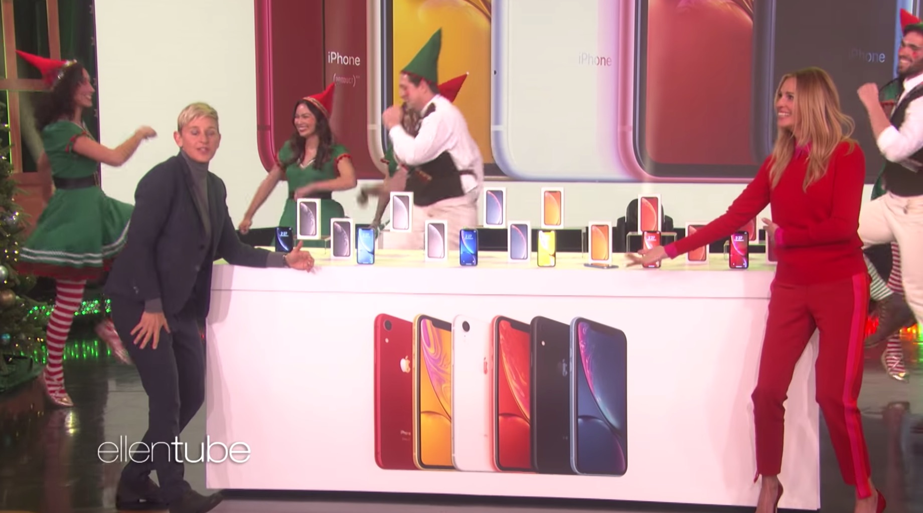 The giveaway took place on a recent episode starring guest Julia Roberts, who participated in a little skit leading up to the giveaway, where the duo played the popular game, “Heads Up”. After doing an incredibly bad job of reading the teleprompter to share some of the iPhone XR’s features (while taking selfies), Ellen announced everyone in the audience would be getting a free iPhone XR. Unbridled joy ensues, and Comet loses his pants. (Just watch the video.)