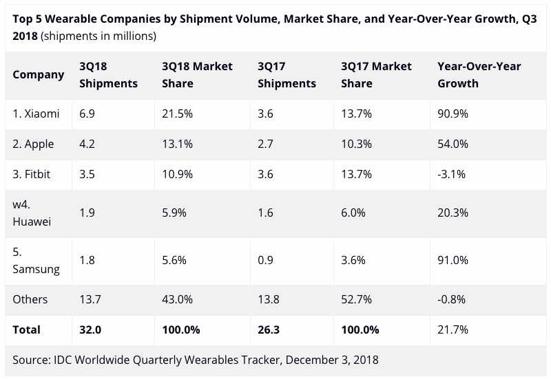 Xiaomi shipped an estimated 6.9 million wearables in the quarter, while Apple took second-place with a 13.1 percent market share. Fitbit took the number 3 slot with an estimated 3.5 million wearable devices shipped, Huawei shipped 1.9 million devices which was good for fourth, and Samsung rounded out the top 5 list with 1.8 million units shipped.