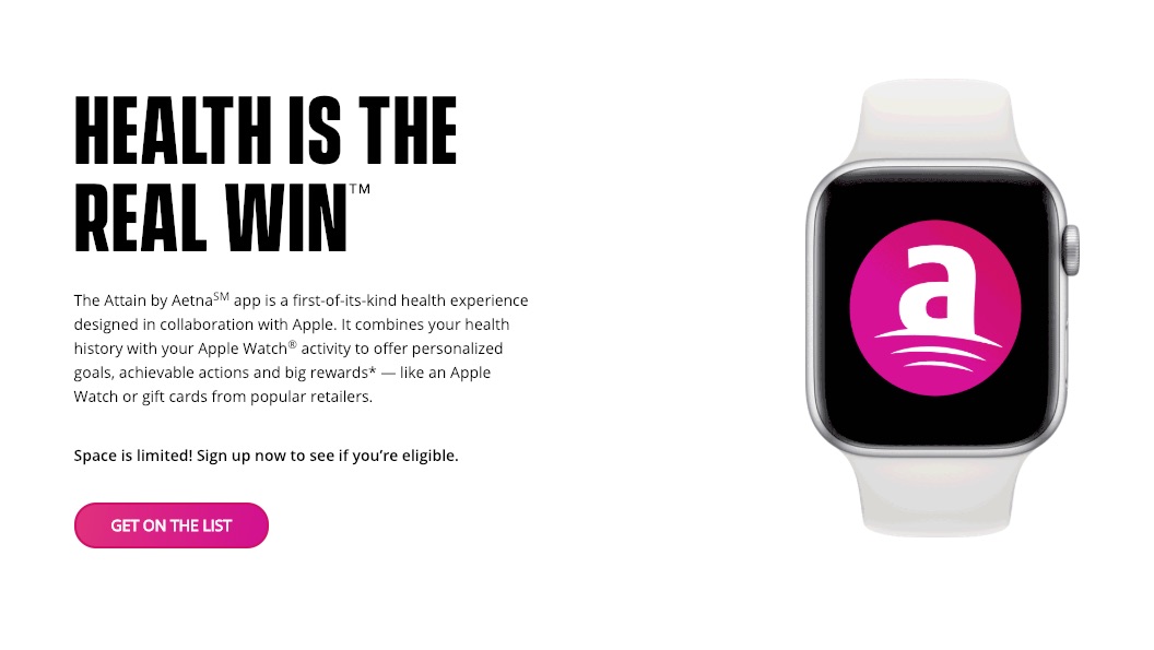 Using an Apple Watch, the Attain app will give Aetna members personalized goals, track daily activity levels, and recommend health lifestyle choices. Participants can earn points, which can be used for gift cards or Apple Watches.