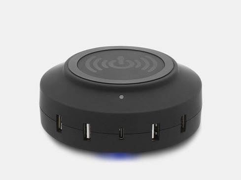 The ChargeHub X5 Elite with Wireless Charging can charge up to six devices simultaneously using the standard USB port, the Type-C power delivery port, or via the wireless charging pad.