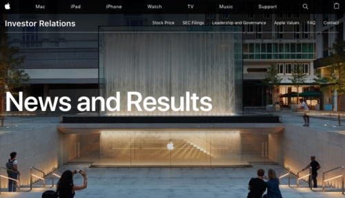 The new page shares a general design theme in line with the company’s product pages. The page features a “News and Results” header, which replaces the old site’s “Apple Investor News” banner. The page features the most recent quarterly results, press releases, and other financial information.