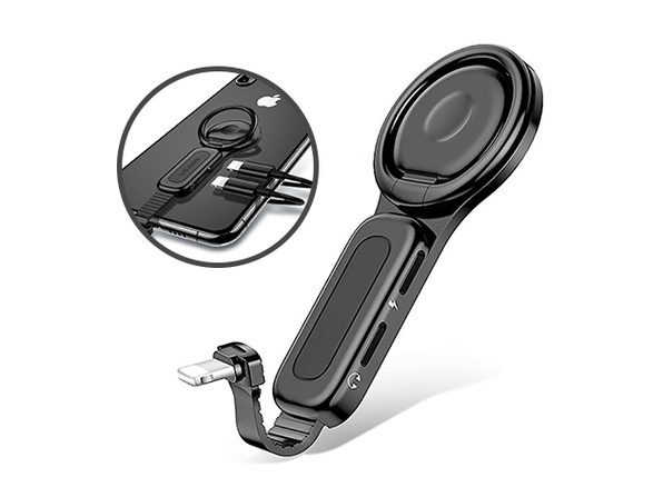 The 2-in-1 Dual Lightning Adapter With Phone Ring Holder gives you two Lightning ports, so you can charge your phone and listen to wired headphones at the same time!