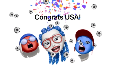 The animated graphic uses a combination of Memojis and iMessage effects to create a USA Women’s Soccer celebration. The quick celebration includes confetting and soccer balls.