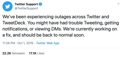 We’ve been experiencing outages across Twitter and TweetDeck. You might have had trouble Tweeting, getting notifications, or viewing DMs. We’re currently working on a fix, and should be back to normal soon.