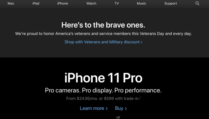 The banner reads, “Here’s to the brave ones,” a spin on Apple’s classic “Here’s to the crazy ones” ad campaign. The tribute to U.S. veterans continues, saying, “We’re proud to honor America’s veterans and service members this Veterans Day and every day.”