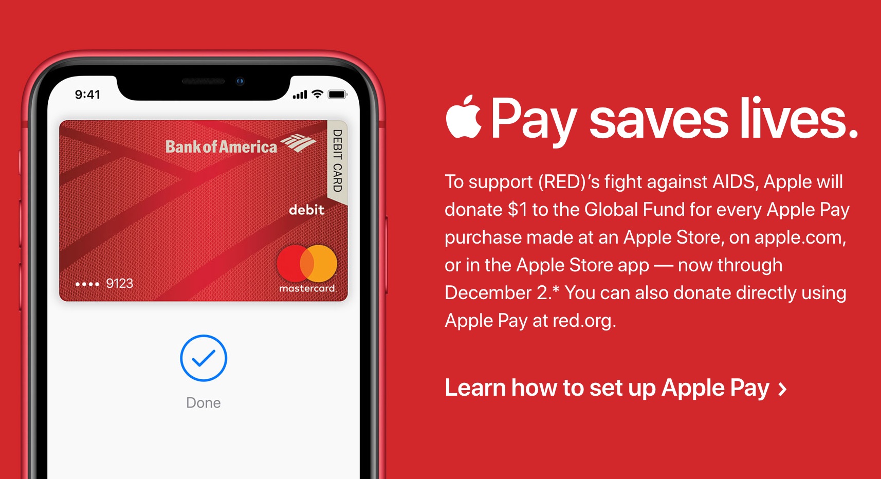 Apple has announced they it will donate $1 to (RED) for every purchase made using Apple Pay through the Apple Store app, on Apple.com or at a physical Apple Store through December 2, up to a total of $1 million. Apple made the announcement on their (PRODUCT)RED information page.