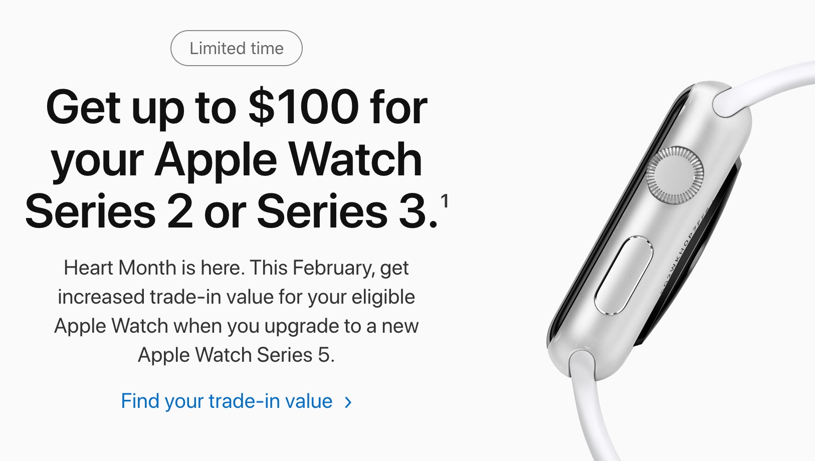 Apple is currently running a “Heart Month” Apple Watch promo that should spur a few purchases of new Watches. The Cupertino firm is offering up to $100 on the trade-in of the Apple Watch Series 2 and ‌Apple Watch‌ Series 3 models, which is a good bump over the trade-in amount Apple usually offers for those devices.