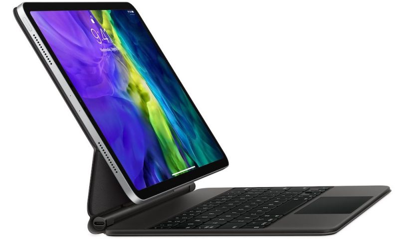 The Magic Keyboard attaches magnetically to iPad Pro, putting the display at a viewing angle of up to 130 degrees. The portable design features a full-size keyboard with backlit keys and a scissor mechanism that delivers 1mm travel. A trackpad is included, which is supported by iPadOS 13.4.