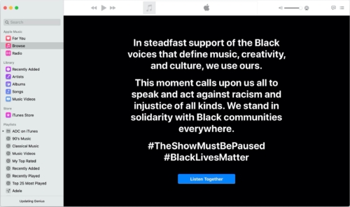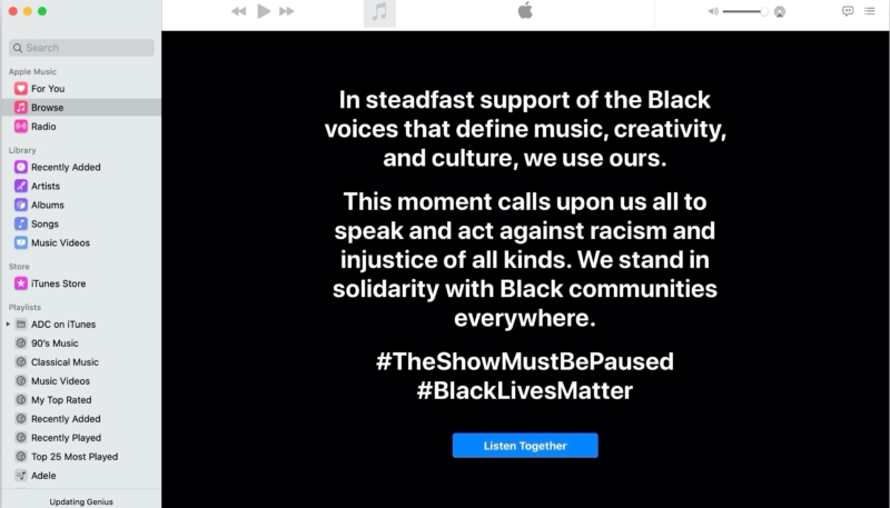 When launching Apple Music today, Mac and iOS users are seeing the message shown below, replacing the usual For You, Browse, and Radio sections, which includes a “Listen Together” button that links to the black music celebration station.