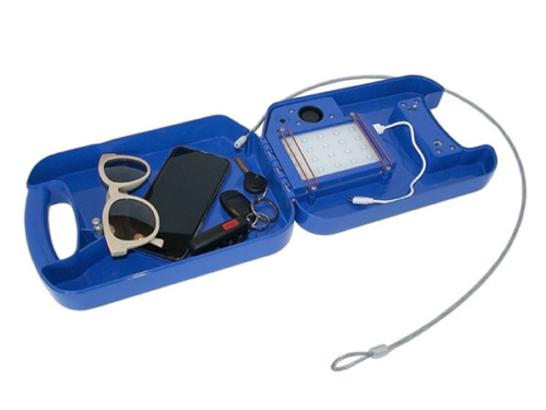 beachsafe® is a patent-pending, personal safe designed for use at the beach or by the pool. Constructed from durable, water-resistant ABS plastic, beachsafe® is equipped with a built-in charger and cooling fan to prevent your electronics from overheating. beachsafe® also has a generous interior that’s roomy enough for wallets, watches, smartphones, jewelry, keys, sunglasses, and other valuables. To top it all off, a high-quality, commercial-grade, 4-digit reprogrammable lock and stainless-steel securing cable provide both convenience and peace-of-mind.