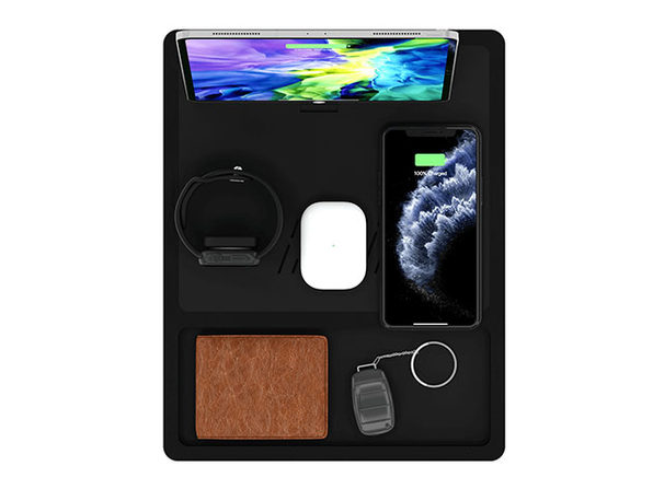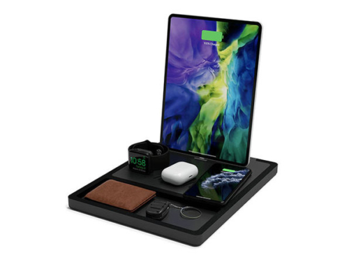 The QUAD TRAY Wireless Charging Station is a 4-in-1 charging station that allows you to wirelessly charge 3 devices at once with the 5-coil full surface area and the built-in MFI-certified Apple Watch charger.