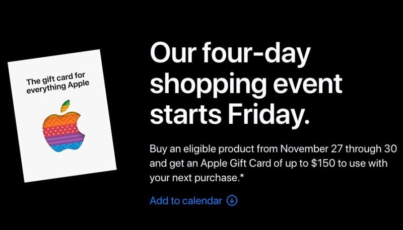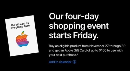Apple has announced its annual four-day shopping event for Black Friday and Cyber Monday in Apple Stores in the United States. As usual, there are no huge discounts on Apple products. Instead, Apple customers can receive up to a $150 Apple Store gift card with the purchase of select products.