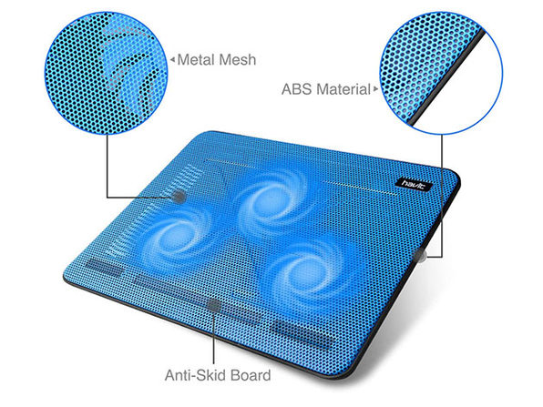 The HAVIT Laptop Cooling Pad cools down your laptop by pushing away hot air around your laptop with cool air underneath the laptop.