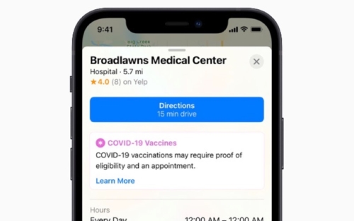 Vaccine location listings provide vaccination operating hours, address, phone number, and a link to the provider’s website where Apple Maps users can get more information about available vaccines and book an appointment.