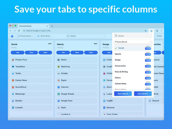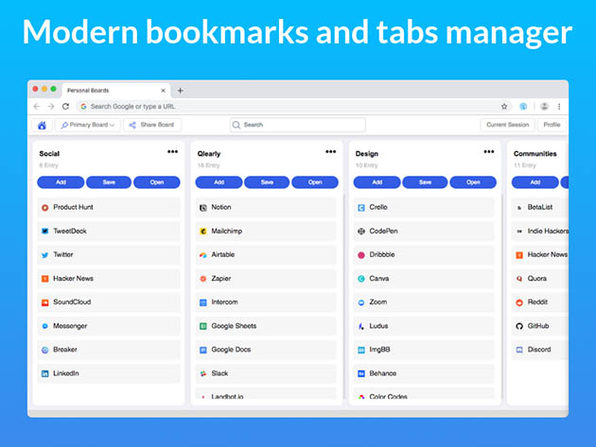 Stop wasting time looking for tabs or bookmarks. Organize them all with Qlearly, your modern bookmarks, and tabs manager. The web platform helps you stay organized by keeping all your favorite apps in one place, while the browser extension helps you access the information you need when you need it. You can now keep all your bookmarks organized by boards and columns and customize them to your liking. Every time you open a new tab, your board will load within a second. You can also sync your bookmarks with multiple devices!