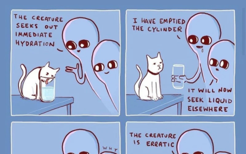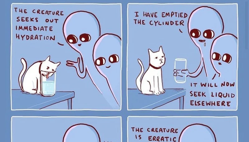 Pyle’s books feature stories of big-eyed, bright blue “beings” from another planet. The aliens perform everyday tasks but describe them strangely. When the aliens sunbathe and sneeze, they describe them as “sun damage” and “face fluid explosions,” respectively. Pyle has released two books and regularly posts comics online.
