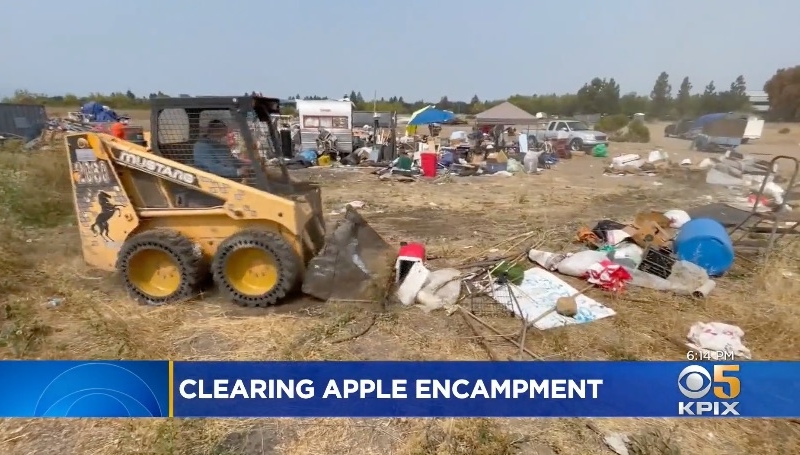 Crews have begun clearing a homeless encampment located on 55 acres of Apple-owned land. An estimated 60 people are being relocated at the Cupertino firm’s expense. rews re relocating people, removing debris, and closing down the area.