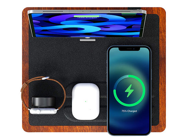NYTSTND QUAD lets you charge up to 4 devices all at once. You can wirelessly charge 3 devices at once with the 5-coil full surface area and the built-in Genuine Apple Watch Magnetic charger. An integrated USB-C connector is available for charging another compatible device. This charging dock packs protection protocols to keep your device and the charger itself safe. NYTSTND QUAD combines aesthetics and performance in a compact, elegant design. Made of premium Amish sourced wood and high-quality real leather, NYTSTND QUAD is designed to blend into any environment.