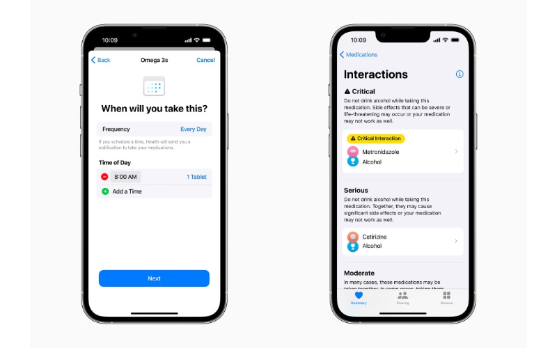 Custom schedules can be created for each medication, whether it needs to be taken multiple times a day, once a week, or as needed, and users can set up reminders to help keep them on track. In the US, users can receive an alert if there are potential critical interactions with medications they have added to the Health app.