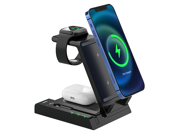 This 6-in-1 Wireless Charging Station has 3 wireless spots for your phone, AirPods, and Apple Watch. There are also integrated Type-C, USB, and Lightning connectors to charge your other devices.