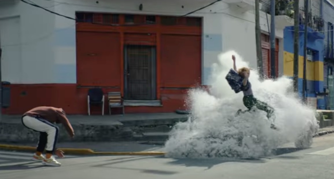 As the pair romp through the city, they turn various objects into snow (including a bus) and at the end of the ad spot, they both vanish into a cloud of snow.