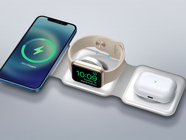 - Floating stand. Snaps & folds into a triangle mode to charge your Apple Watch and smartphone in landscape mode for video playback, FaceTiming, and more