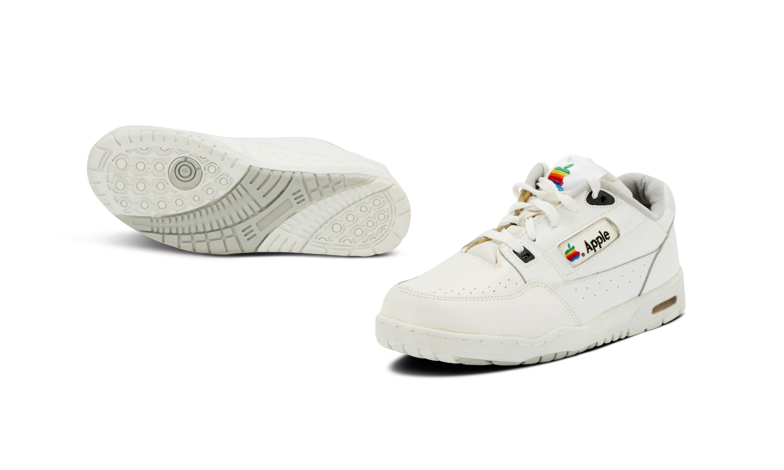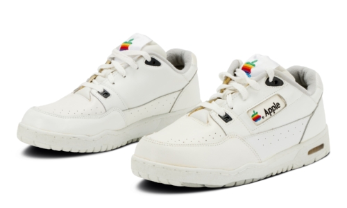 An “ultra-rare” pair of mid-90s Omega Sports official Apple Computer sneakers are now on sale from the auction house Sotheby’s for $50,000 (via BBC News).