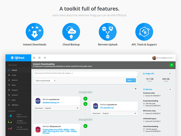 With Offcloud, you can unlock file-hosting and streaming sites, download securely from BitTorrent, access and fetch from Usenet/newsgroups, unlock all restrictions from Uploaded, backup any video from YouTube, convert Soundcloud entries to MP3 files, remotely sync your files with the cloud, unlock all types of restrictions, speed up downloads and save bandwidth, stay completely anonymous & secure, convert the entire web to PDF, save online articles like Pocket or Evernote—and more!