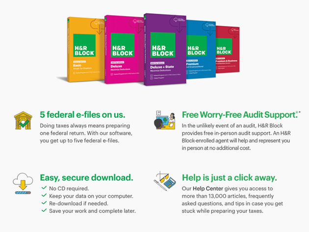 H&R Block Deluxe Tax Software helps tax filers maximize deductions on homes and other investments and gives them everything they need to easily file federal taxes and get their maximum refund guaranteed. It includes step-by-step guidance on more than 350 credits and deductions, a help center with over 13,000 searchable articles, and in-person representation in the unlikely event of an audit.