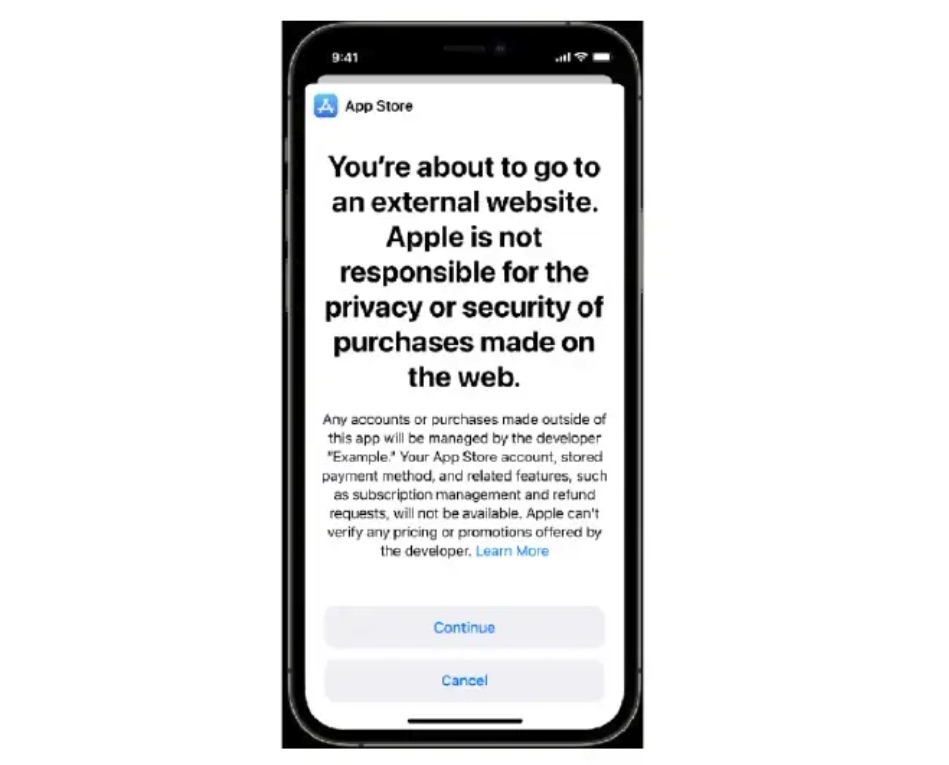 Apple will throw up an in-app warning to customers on their device’s screen, to let them know that they are leaving the App Store ecosystem to make a purchase on an external website not under Apple’s control and that App Store protections will not be available.