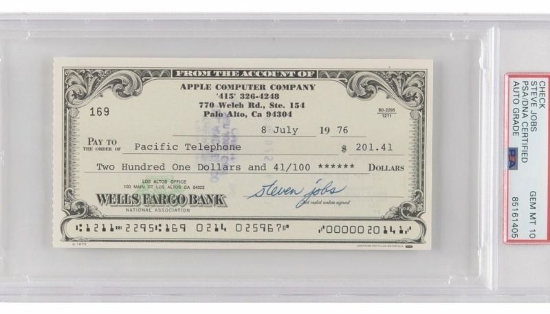 A 1976 “Apple Computer Company” check signed by Steve Jobs is currently up for auction. The check, which Jobs signed to pay for Apple’s Pacific Telephone service bill was written on July 8, 1976, for the amount of $201.41. The address on the check is “770 Welch Rd., Ste. 154, Palo Alto,” which was the first official business address of Apple.