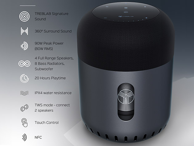 Experience immersive sound with the TREBLAB HD-360 Portable Bluetooth Speaker. With 360° surround sound and 90W peak power, enjoy crystal-clear audio wherever you go. Its Bluetooth 5.0 and NFC technology ensure seamless connectivity, while the IPX4 waterproof design lets you take the party anywhere. Get ready to elevate your listening experience with TREBLAB HD-360.