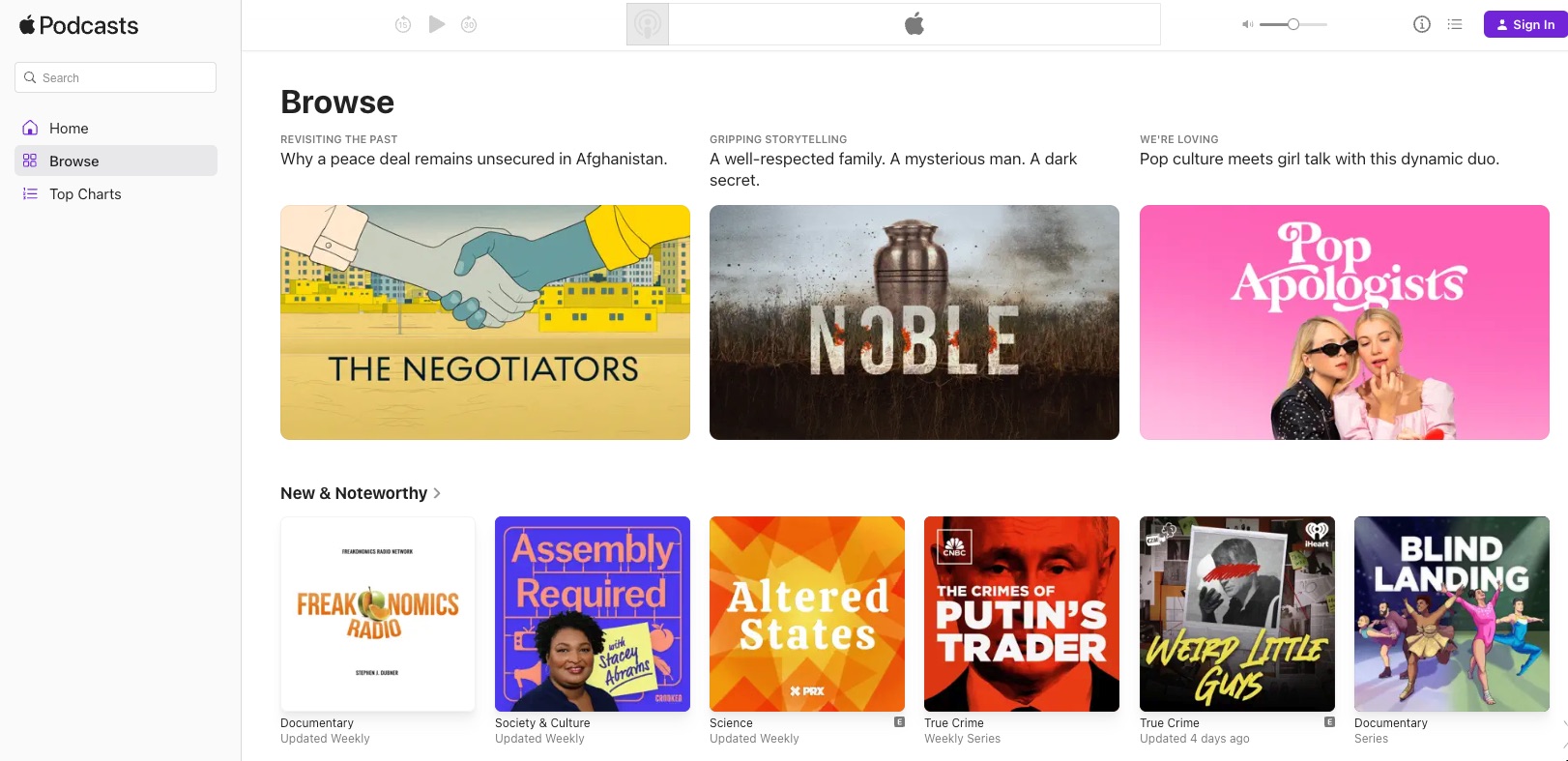 Apple today announced that Apple Podcasts can now be listened to in your browser, with no need for the Podcasts app. The new feature is compatible with Safari, Chrome, Edge, and Firefox on Macs, PCs, and other devices. Users can search for, browse through, and listen to podcasts with access to the Up Next queue and library in the browser when they are signed into an Apple Account.