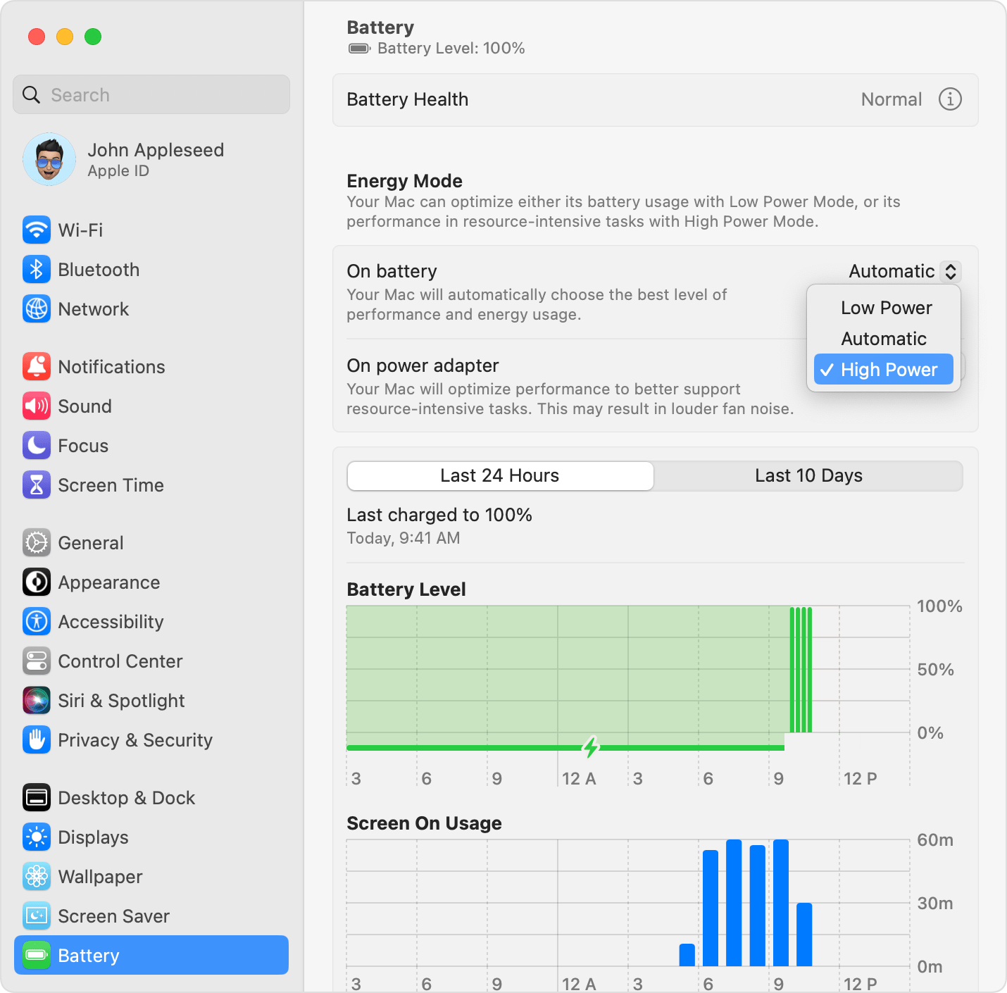 Choose High Power Mode from the “On battery” or the “On power adapter” pop-up menu under Energy Mode.