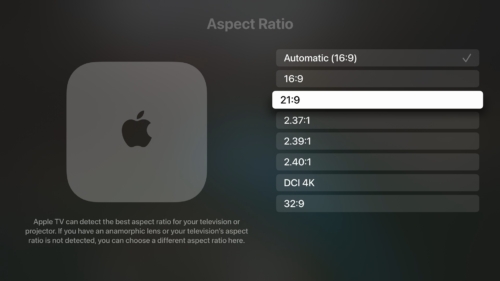 The update includes a new option that lets the Apple TV automatically detect the best aspect ratio for a television or projector. Aspect ratio options include 16:9, 21:9, 2.37:1, 2.39:1, 2.40:1, DCI 4K, and 32:9.