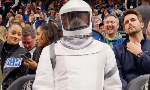 An actor dressed in a post-apocalyptic “cleaning suit” sat courtside at an Dallas Mavericks basketball game.