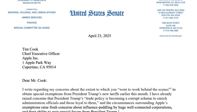 Democrat U.S. Senator Elizabeth Warren has sent a letter to Apple CEO Tim Cook requesting more information about his relationship with the Donald Trump administration when it comes to import tariffs.